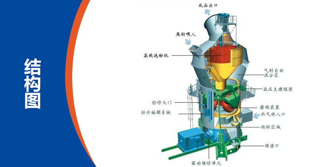 电动机驱动减速机带动立式磨机磨盘转动,将粉磨的石墨碎料由锁风喂料设备送入旋转的磨盘中心,在离心力作用下,石墨碎块向磨盘周边移动,进入粉磨辊道。在立磨磨辊压力的作用下,石墨碎块受到挤压、研磨和剪切作用而被粉碎。同时,热风从围绕磨盘的风环高速均匀向上喷出,粉磨后的超细石墨粉被风环处的高速气流吹起,一方面把粒度较粗的石墨粉吹回磨盘重新粉磨,另一方面对悬浮超细石墨粉进行烘干,细粉则由热风带入分离器进行分级,合格的超细石墨粉细粉随同气流出磨,由收尘设备收集下来,即为产品,不合格的石墨粗粉在分离器叶片作用下重新落至磨盘,与新喂入的物料一起重新磨,如此循环,完成粉磨作业全过程。