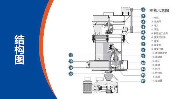 铝矿石磨粉机内部结构比较简单,主要由主机、电机、鼓风机、分析机、管道装置等几部分组成,其中主机作为该设备的主要部件,又包括了磨辊、磨环、铲刀、进风蜗壳、机架、罩壳等。